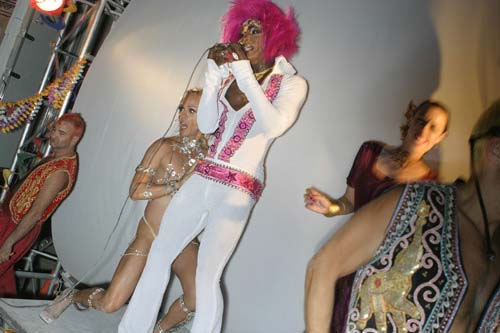 My best night of dancing was at the Space Virgins party. Described in another section, the Space Virgins space was just great. And the mix they were throwing up was fantastic. With the open bar, this was the place to dance that night. Now, the Space Virgins camp had people dancing between the columns of the facade - to keep track of things I guess. And this one guy kept looking at me, and after a while started signaling by pointing to his ears. Basically he was trying to tell me that I was going to deaf because I'd spent an hour within 2 feet of a giant speaker that was so loud I know you could hear it a mile away. Frankly, I didn't much care at the time.. I was having just too much fun. For various parts of the music I just stuck my head right into the speakers... you know.. during one of those lulls in a DJ mix where they are just light on the beat but you know it's going to crescendo and blow you away if you are ready for it. (big grin) I did take short 10 minute breaks every 30 to 40 minutes or so to hit the open bar and catch a breath. And I got to talking to this guy.. he was not with the Space Virgins.. just someone else who found a good place to watch the crowd. He was going to get up at dawn and take some photos of the sunrise. I wished him luck as it was already 3:00 am by the time he told me this.